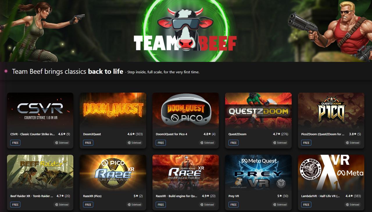 Team Beef成立于2019年,一直在开发VR Mod并尝试将经典作品带入VR,例如《毁灭战士》系列、《重返德军总部》《Doom3》《星球大战:绝地武士》系列、《CS》等游戏的VR移植版,他们的VR游戏目前可在购买游戏本体后在Sidequest上免费侧载体验。约翰·卡马克表示,他曾尝试向id Software提供100万美元的销售保证,以允许Team Beef在官方Quest商店销售其VR移植作品。