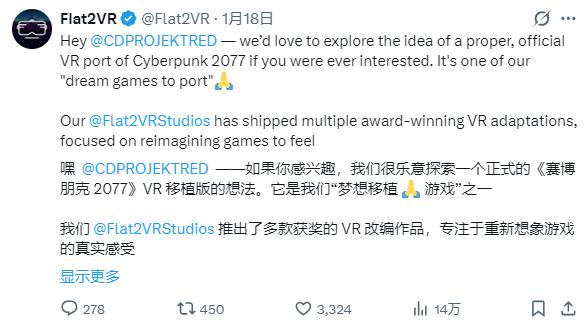 就在CD Projekt高管针对Luke Ross的《赛博朋克 2077》VR Mod问题作出公开回应后不久,VR游戏工作室Flat2VR通过官方账号“喊话”CD Projekt,表达了寻求合作并探索“正式、官方VR移植版本”的意愿,不过CD Projekt方面还未公开给出回应。