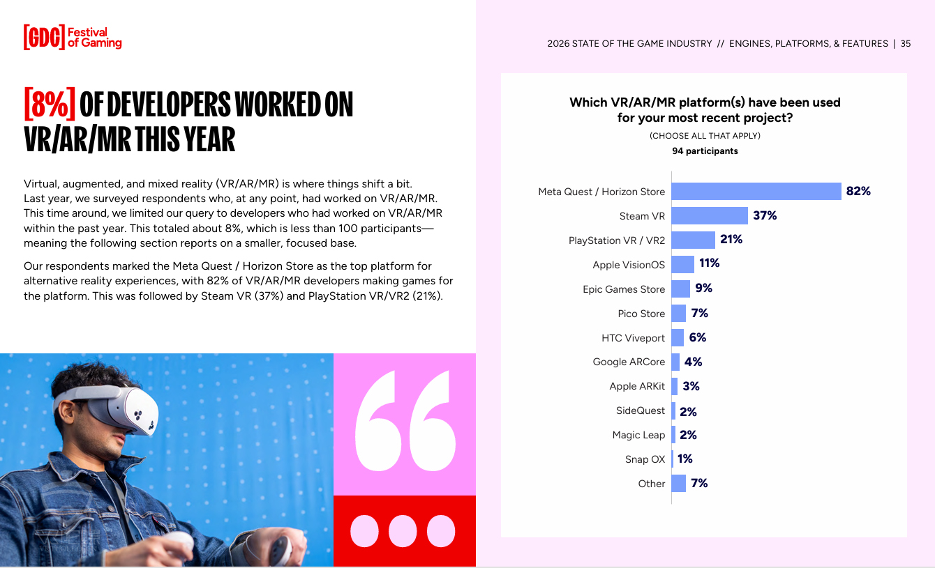 VR/AR/MR开发者比例仅占8%。主要平台为Meta Quest,有82%的VR/AR/MR开发者为该平台开发游戏。紧随其后的是SteamVR(37%)、PlayStation VR/VR2(21%)和visionOS(11%)。Valve新公布的Steam Frame VR头戴设备未纳入本次调查。