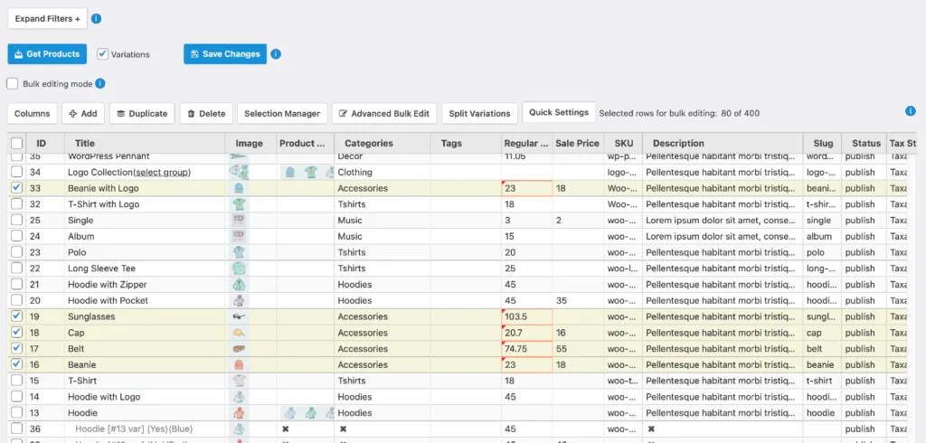 使用 WooCommerce Advanced Bulk Edit 插件补充了 WooCommerce 中缺少的但又必备的功能。它可以方便的一次编辑/更新数千个产品。避免逐个编辑产品的繁琐过程。提高商店运营管理效率,将宝贵的时间花在最需要的地方。