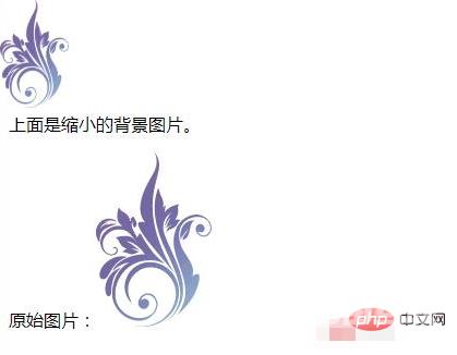 <!DOCTYPE html><html><head><style> body{background:url(/i/bg_flower.gif);background-size:63px 100px;-moz-background-size:63px 100px; /* 老版本的 Firefox */background-repeat:no-repeat;padding-top:80px;}</style></head><body><p>上面是缩小的背景图片。</p><p>原始图片:<img src="/i/bg_flower.gif" alt="Flowers"></p></body></html>效果图:
