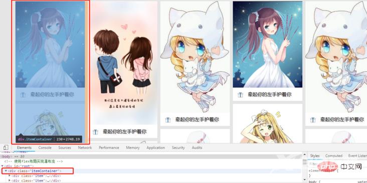 /* css文件 */body{ background: #e5e5e5;}#root{ display: flex; flex-direction: row; margin: 0 auto; width: 1200px;}.itemContainer{ margin-right: 10px; flex-direction: column; width: 240px;}.item{ margin-bottom: 10px; background: #fff;}.itemImg{ width: 100%;}.userInfo { padding: 5px 10px;}.avatar { vertical-align: middle; width: 30px; height: 30px; border-radius: 50%;}.username { margin-left: 5px; text-shadow: 2px 2px 2px rgba(0, 0, 0, .3);}
