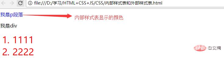 <!DOCTYPE><html><head> <meta charset="utf-8" /> <title>内部样式表和外部样式表的优先级</title> <!--外部样式表--> <link rel="stylesheet" type="text/css" href="css/style.css" /> <!--内部部样式表--> <style type="text/css"> p{ color: blue; } </style></head><body> <p>我是p段落</p> <p>我是p</p> <ol> <li>1111</li> <li>2222</li> </ol></html>浏览器运行效果: