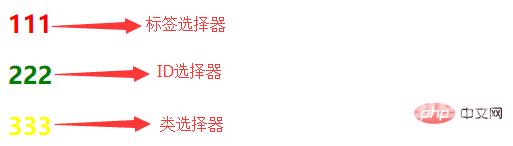<!DOCTYPE><html><head> <meta charset="utf-8" /> <title>选择器的优先级</title> <style type="text/css"> #a{ color: green; } .b{ color: yellow; } h2{ color: red; } </style></head><body> <h2>111</h2> <!--红色--> <h2 id="a" class="b">222</h2> <!--绿色--> <h2 class="b">333</h2><!--黄色--></html>浏览器运行效果: