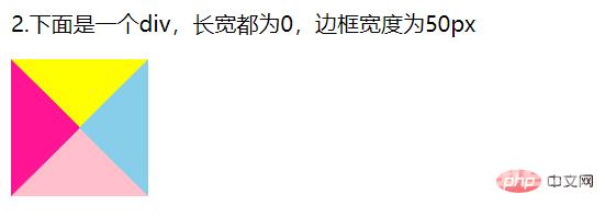 接下来,把正方形的宽高都设为0,只剩下50px的边框,我们来看看效果图,是不是出现了四个三角形?是的,边框已经没有再包裹任何东西了。只剩下边框它本身了。