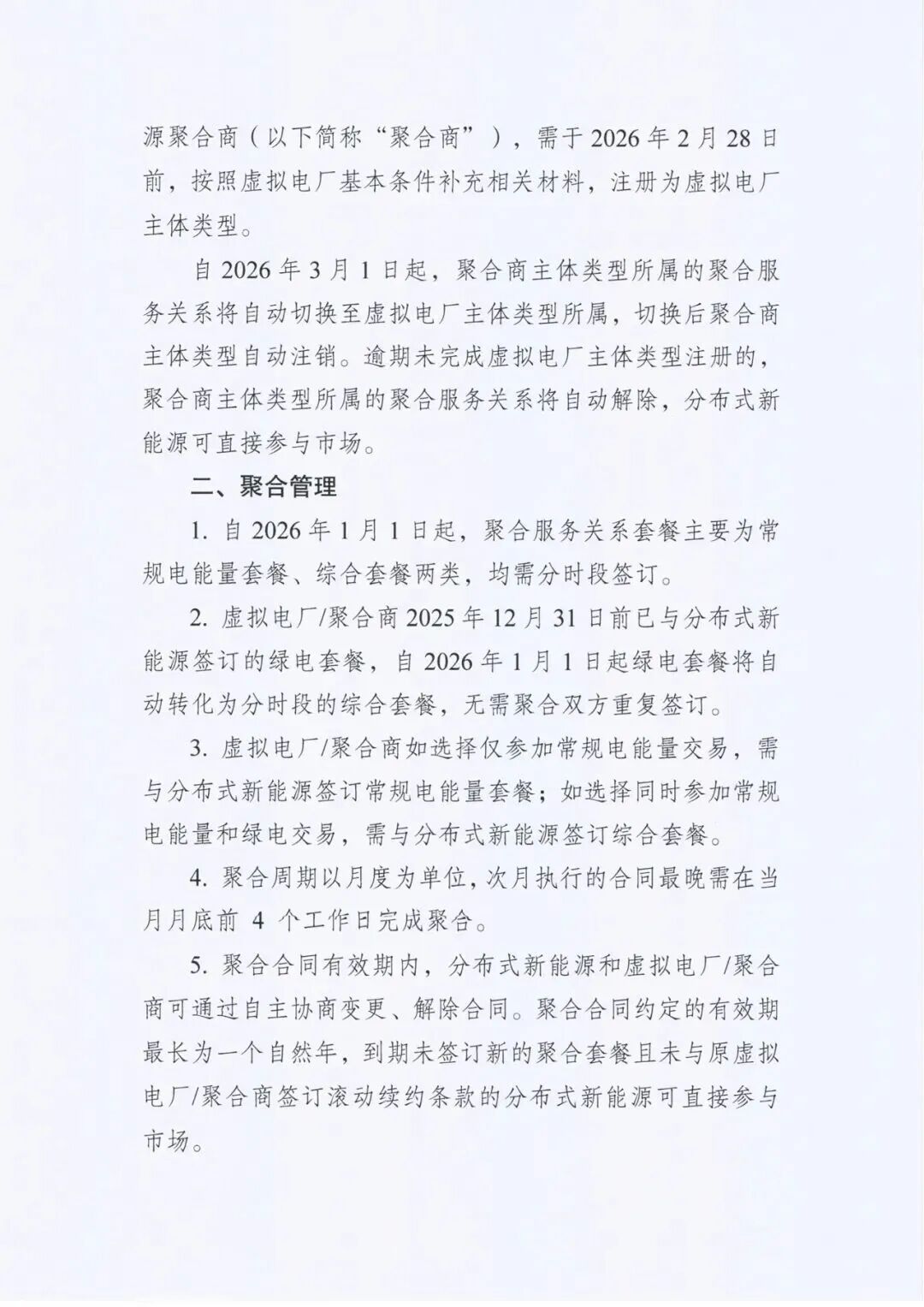 虚拟电厂/聚合商2025年12月31日前已与分布式新能源签订的绿电套餐,自2026年1月1日起绿电套餐将自动转化为分时段的综合套餐,无需聚合双方重复签订。