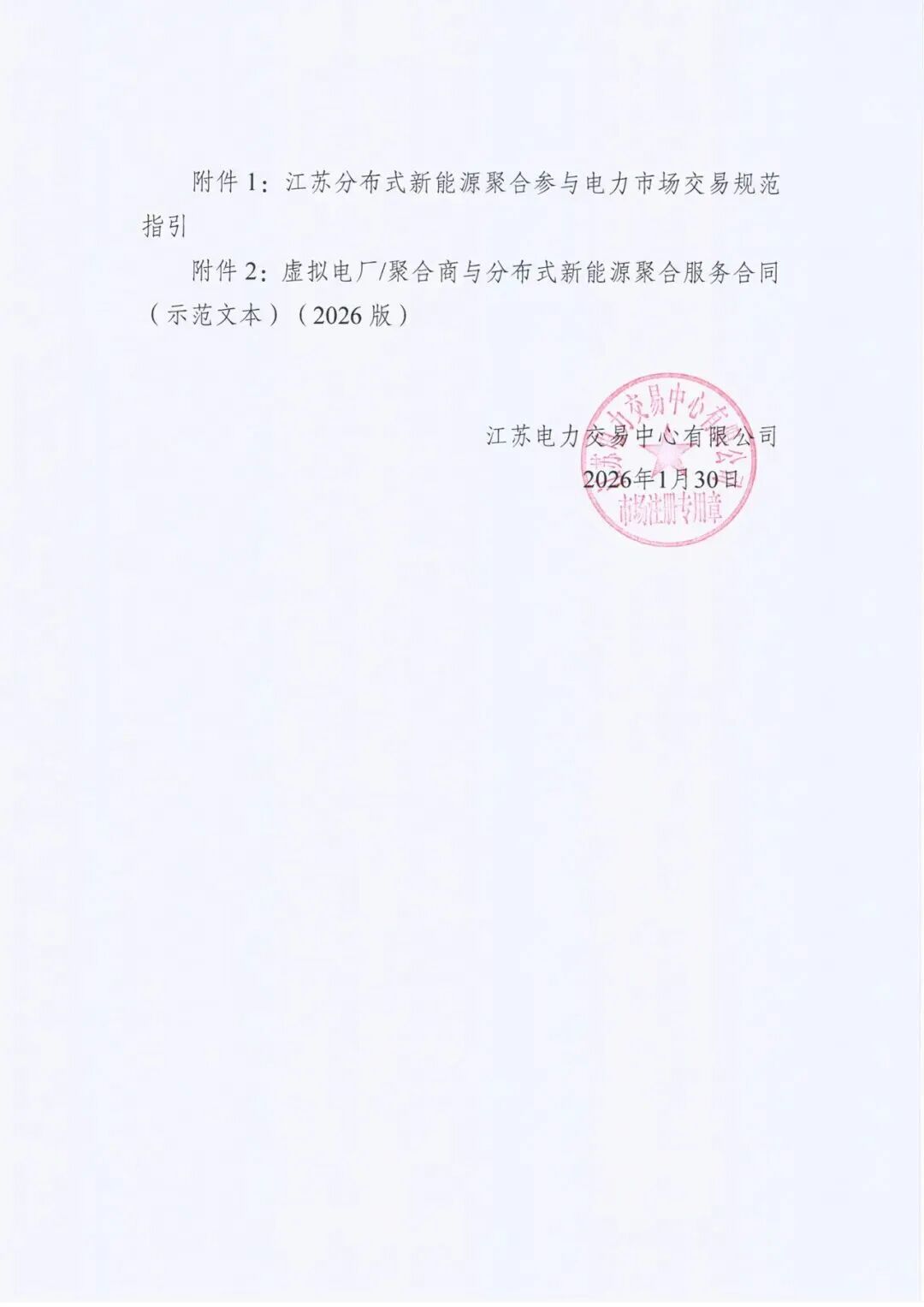 1月31日,江苏电力交易中心发布《关于开展江苏分布式新能源聚合参与电力市场交易相关工作的通知》。文件指出,江苏分布式新能源聚合参与电力市场的经营主体主要包括分布式新能源、虚拟电厂等。已注册生效的分布式新能源聚合商,需于2026年2月28日前,按照虚拟电厂基本条件补充相关材料,注册为虚拟电厂主体类型。