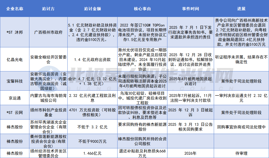 宝馨科技因未履行投资协议,被安徽怀远、内蒙古鄂托克旗两地国资追讨合计超4.7亿元股权投资款及违约金;京运通遭乌海国资代建方追讨2.44亿元工程款;亿晶光电被全椒经开区管委会要求解除投资协议,追讨1.4亿元政府出资款及相关费用;沐邦高科则被梧州市政府责令退回5.1亿元财政补助与扶持款,并支付5100万元违约金。据不完全统计,2025年光伏企业与地方国资的涉诉金额已超20亿元。