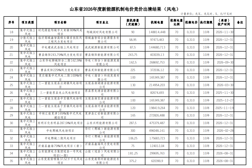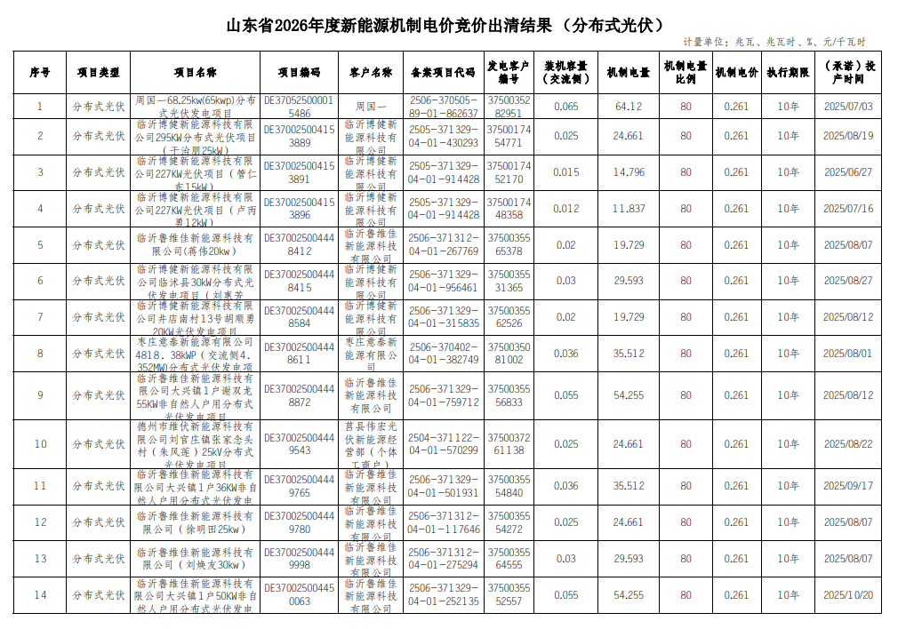 根据《关于印发<山东省新能源上网电价市场化改革实施方案>的通知》(鲁发改价格〔2025〕576号)、《关于印发<山东省新能源机制电价竞价实施细则>的通知》(鲁发改价格〔2025〕577号)、《关于2026年新能源机制电价竞价工作有关事项的通知》(鲁发改价格〔2025〕904号)等文件规定,已完成竞价材料提交、资质和履约保函审核、价格出清等程序,现将山东省2026年度新能源机制电价竞价出清结果予以公示(详见附件)。
