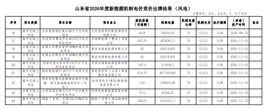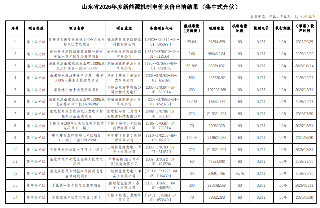 关于山东省2026年度新能源机制电价竞价出清结果的公示