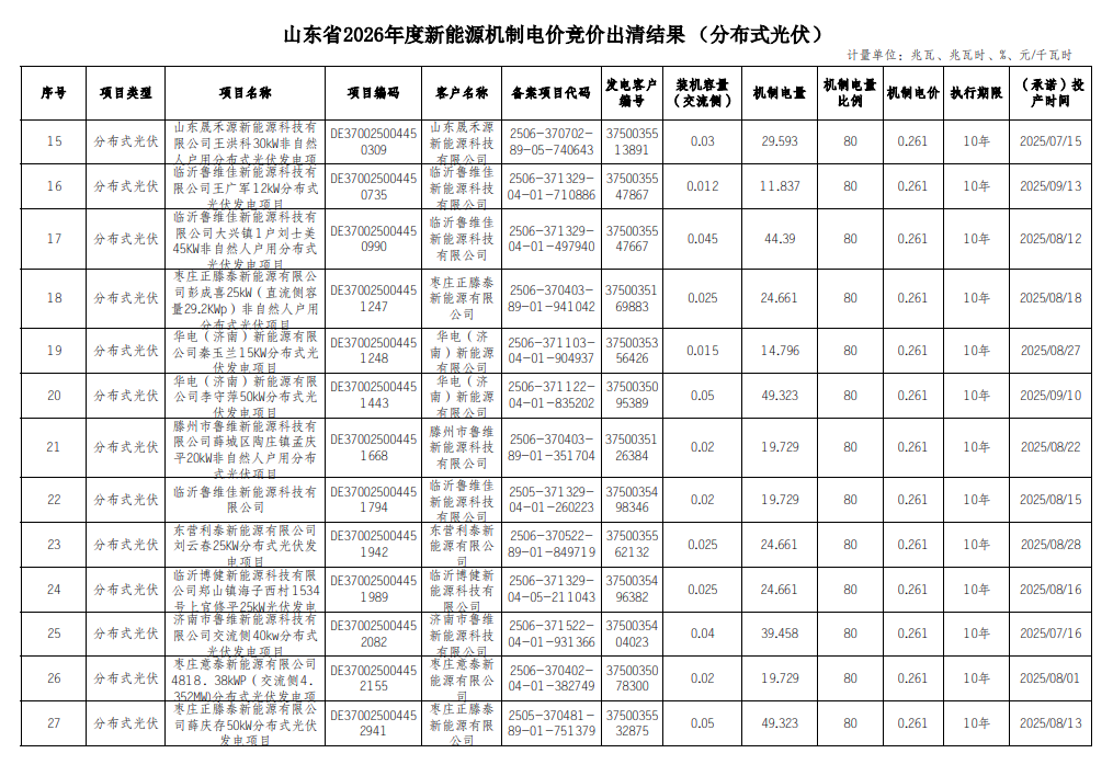 附件:山东省2026年度新能源机制电价竞价出清结果(以下仅展示部分项目,全部项目请登陆国网新能源云查看)