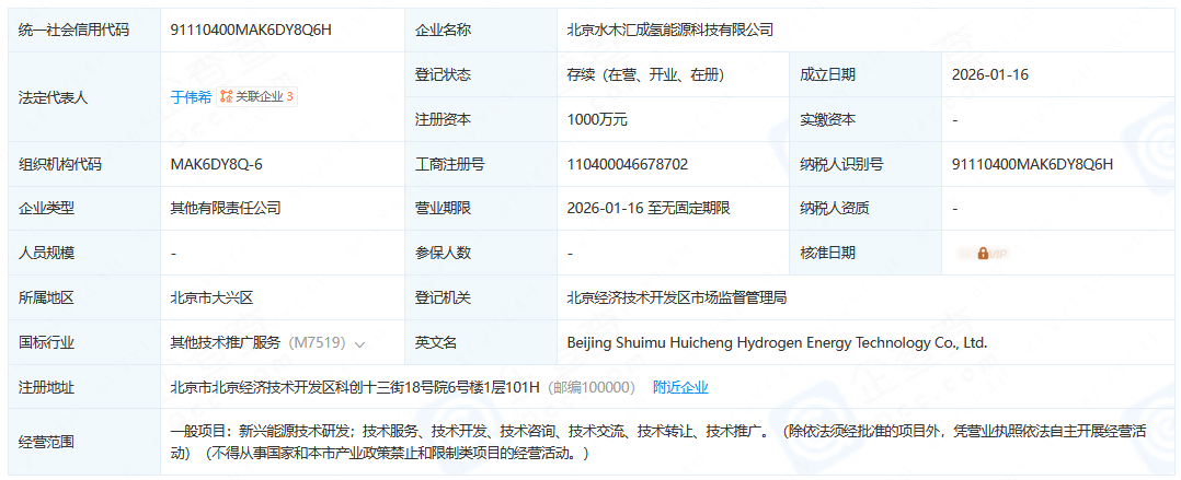 2026-01-16,北京水木汇成氢能源科技有限公司成立,注册资本1000万元,法定代表人于伟希。