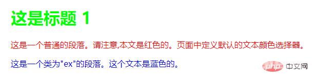 <!DOCTYPE html><html><head><meta charset="utf-8"> <title></title> <style>body {color:red;}h1 {color:#00ff00;}p.ex {color:rgb(0,0,255);}</style></head><body><h1>这是标题 1</h1><p>这是一个普通的段落。请注意,本文是红色的。页面中定义默认的文本颜色选择器。</p><p class="ex">这是一个类为"ex"的段落。这个文本是蓝色的。</p></body></html>我们来看下运行效果: