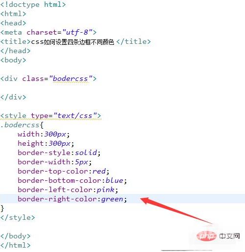 在css中,可以利用border-top-color、border-bottom-color、border-left-color、border-right-color属性来分别设置上边框、下边框、左边框和右边框的颜色即可。