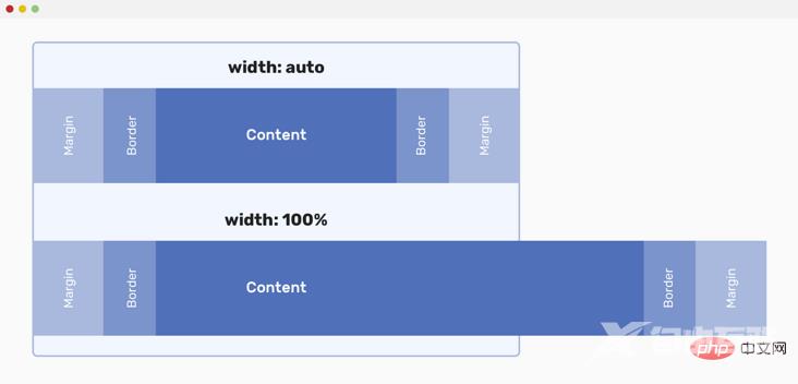 当一个元素的宽度值为auto时,它包含margin、padding和border,不会变得比它的父元素大。其中 content 的宽度将是content本身减去margin、padding和border。