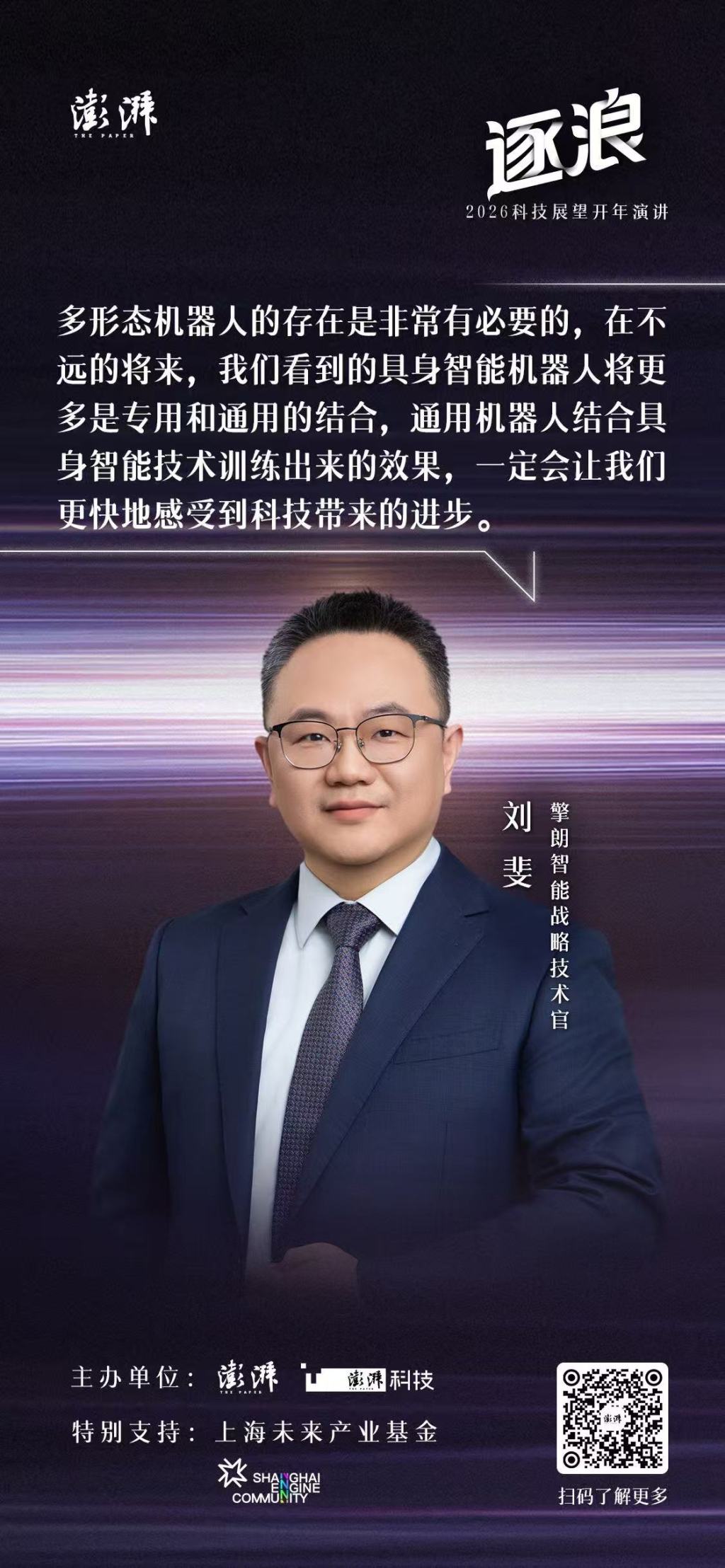 1月29日,在(www.thepaper.cn)于上海举办的“2026科技展望开年演讲”上,上海擎朗智能科技股份有限公司(以下简称“擎朗智能”)战略技术官刘斐围绕“具身智能的能与不能”展开分享。