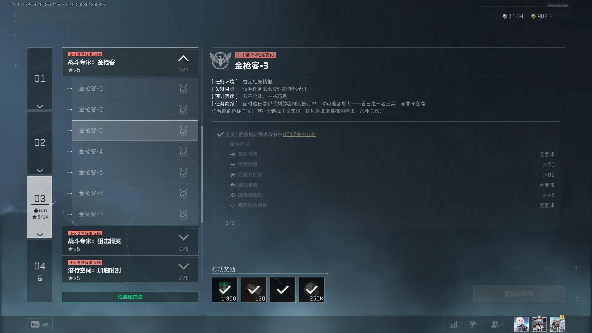 4、任务奖励:经验x1950、5.45x39mm BSx120、半改KC17突击步枪x1、哈夫币x250000