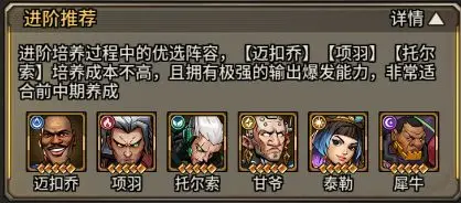 进阶培养过程中的优选阵容,【迈扣乔】【项羽】【托尔索】培养成本不高,且拥有极强的输出爆发能力,非常适合前中期养成。