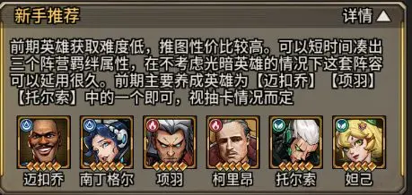 前期英雄获取难度低,推图性价比较高。可以短时间凑出三个阵营羁绊属性,在不考虑光暗英雄的情况下这套阵容可以延用很久。前期主要培养英国为[迈扣乔][项羽]【托尔索】中的一个即可,视抽卡情况而定。