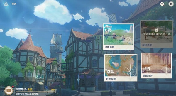 6.也可以领取“世界探索、蒙德任务、璃月任务”来提升声望值,声望值的提升可以解锁特殊城市功能;