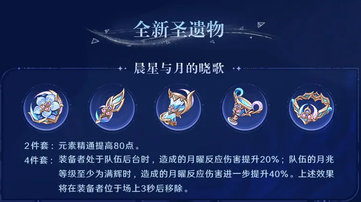 在原神月之四版本中,新圣遗物晨星与月的晓歌即将上线,其套装效果可提升装备者的元素精通。以下为该圣遗物的详细属性与适用角色解析,供各位旅行者参考。
