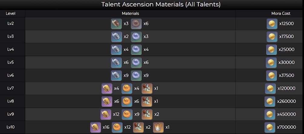 天赋升级突破材料: