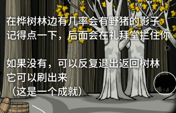 13、在桦树林边有几率会有野猪的影子,点一下后后面会在礼拜堂拦住我们,也可以获得一个成就