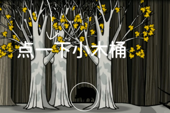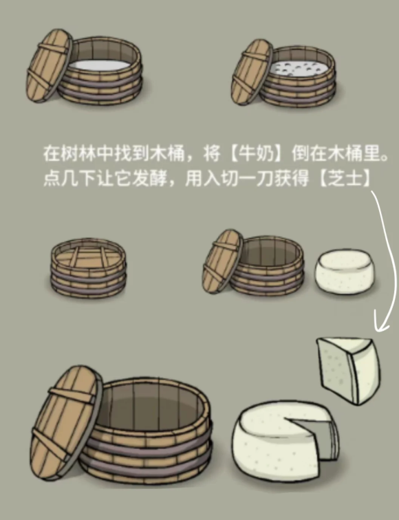 15、在树林中找到木桶,将牛奶倒在木桶里,点几下让它发酵,切一刀可以获得芝士