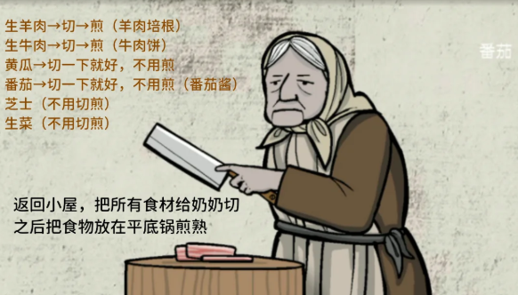 22、返回小屋后把所有的食材给奶奶切,之后把食物放在平底锅煎熟