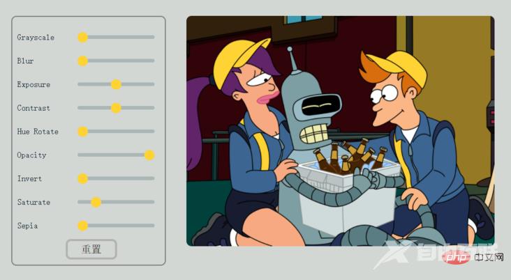 <form id="imageEditor"> <p> <label for="gs">Grayscale</label> <input id="gs" name="gs" type="range" min="0" max="100" value="0"> </p> <p> <label for="blur">Blur</label> <input id="blur" name="blur" type="range" min="0" max="10" value="0"> </p> <p> <label for="br">Exposure</label> <input id="br" name="br" type="range" min="0" max="200" value="100"> </p> <p> <label for="ct">Contrast</label> <input id="ct" name="ct" type="range" min="0" max="200" value="100"> </p> <p> <label for="huer">Hue Rotate</label> <input id="huer" name="huer" type="range" min="0" max="360" value="0"> </p> <p> <label for="opacity">Opacity</label> <input id="opacity" name="opacity" type="range" min="0" max="100" value="100"> </p> <p> <label for="invert">Invert</label> <input id="invert" name="invert" type="range" min="0" max="100" value="0"> </p> <p> <label for="saturate">Saturate</label> <input id="saturate" name="saturate" type="range" min="0" max="500" value="100"> </p> <p> <label for="sepia">Sepia</label> <input id="sepia" name="sepia" type="range" min="0" max="100" value="0"> </p> <input type="reset" form="imageEditor" id="reset" value="Reset" /></form><div id="imageContainer" class="center"> <img src="futurama.png"></div>