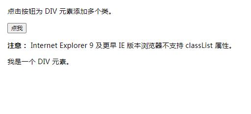 <!DOCTYPE html><html><head><meta charset="utf-8"><title>document</title><style>.mystyle { width: 500px; height: 50px; padding: 15px; border: 1px solid black;}.anotherClass { background-color: coral; color: white;}.thirdClass { text-transform: uppercase; text-align: center; font-size: 25px;}</style></head><body><p>点击按钮为 DIV 元素添加多个类。</p><button onclick="myFunction()">点我</button><p><strong>注意:</strong> Internet Explorer 9 及更早 IE 版本浏览器不支持 classList 属性。</p><div id="myDIV">我是一个 DIV 元素。</div><script>function myFunction() { document.getElementById("myDIV").classList.add("mystyle", "anotherClass", "thirdClass");}</script></body></html>效果: