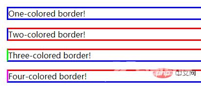 <!DOCTYPE html><html><head><meta charset="utf-8"> <title></title><style>p.one{ border-style:solid; border-color:#0000ff;}p.two{ border-style:solid; border-color:#ff0000 #0000ff;}p.three{ border-style:solid; border-color:#ff0000 #00ff00 #0000ff;}p.four{ border-style:solid; border-color:#ff0000 #00ff00 #0000ff rgb(250,0,255);}</style></head><body><p class="one">One-colored border!</p><p class="two">Two-colored border!</p><p class="three">Three-colored border!</p><p class="four">Four-colored border!</p></body></html>我们运行下看看效果: