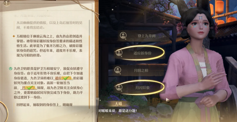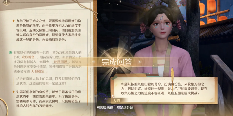 无限暖暖2.2版本的九色万相主线任务中,推理的答案分别是扮演身份签、破解诅咒、月相;适应新身份、月闪异象;欢欣筹备、吃团圆饭、万相通宝,其它的变换形象答案内容见以下正文内容!