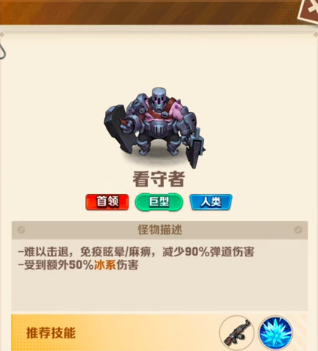 行动缓慢几乎无法被击退,可连续攻击两次,免疫晕眩和麻痹,减少90%弹道伤害,受到额外50%冰系伤害