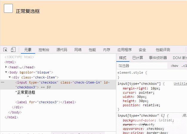 <!DOCTYPE html><html> <head> <meta charset="utf-8" /> <title>document</title> <style> input[type="checkbox"] { margin-right: 10px; cursor: pointer; width: 30px; height: 30px; position: relative; } </style> </head> <body bgcolor="bisque"> <div class="check-item"> <input type="checkbox" class="check-item-in" id="checkbox3" />正常复选框 <label for="checkbox3"></label> </div> </body></html>效果如图: