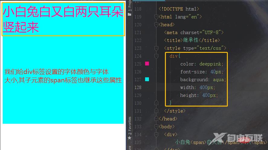 <!DOCTYPE html><html><head> <meta charset="UTF-8"> <title>继承性</title> <style type="text/css"> div{ color: deeppink; font-size: 40px; background: aqua; width: 400px; height: 400px; } </style></head><body> <div> 小白兔<span>白又白</span>两只<span>耳朵</span>竖起来 </div></body></html>效果图: