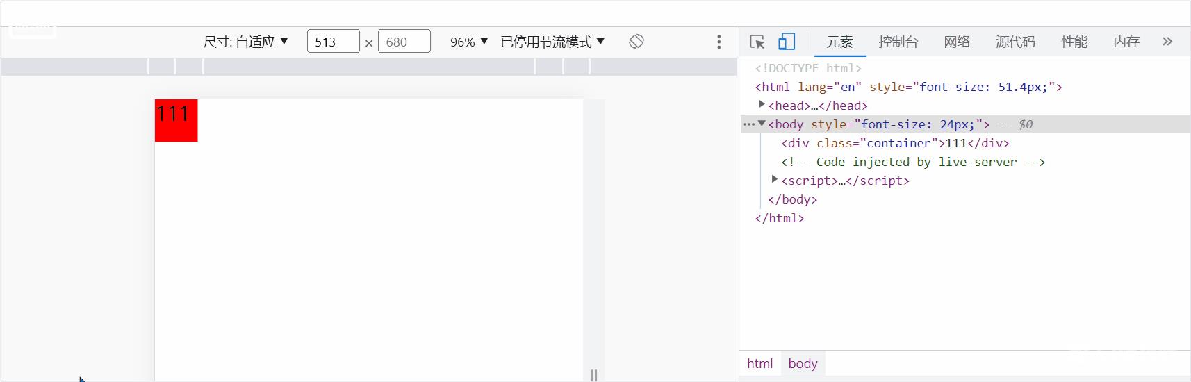 <style> *{margin: 0;padding: 0;} html{ height: 37.5px; } .container{ width: 1rem; height: 1rem; background-color: #f00; }</style><script src="../index.js"></script><body> <div class="container">111</div></body>