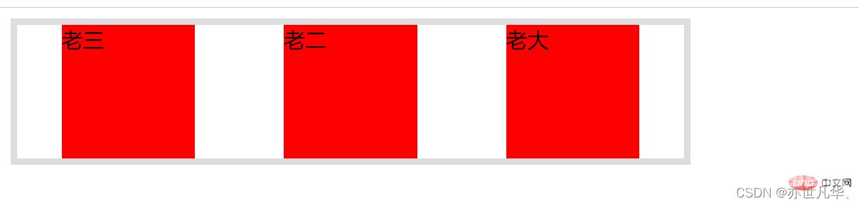 <style> .container{ width: 500px; border: 5px solid #ddd; display: flex; justify-content: space-around; } .container div{ width: 100px; height: 100px; background-color: #f00; } #d1{ order: 3; } #d2{ order: 2; } #d3{ order: 1; }</style><body> <div class="container"> <div id="d1">老大</div> <div id="d2">老二</div> <div id="d3">老三</div> </div></body>
