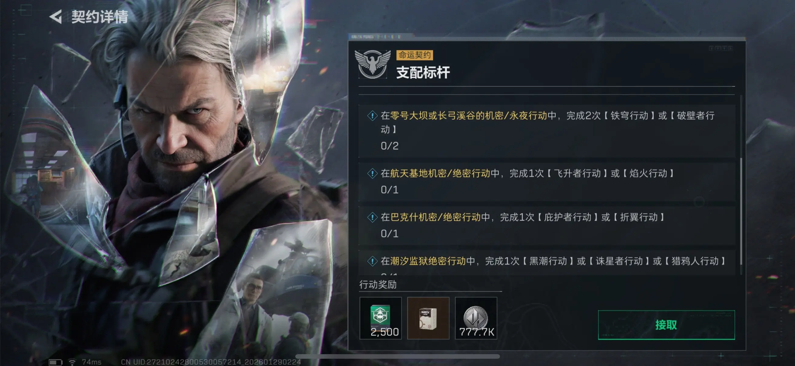 零号大坝或长弓溪谷的机密/永夜行动,完成2次【铁穹行动】或【破壁者行动】;