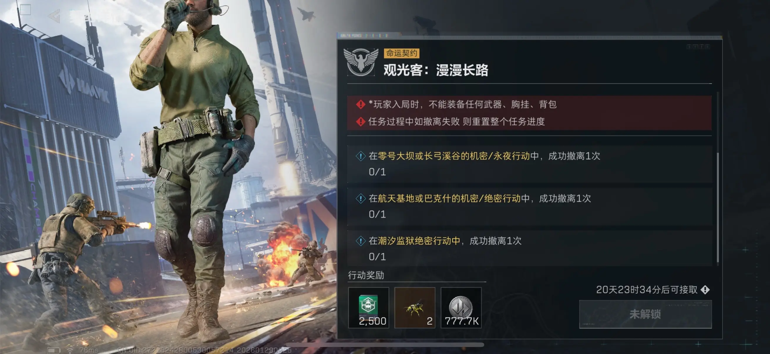 任务要求:入局时不装备任何背包、胸挂、武器;
