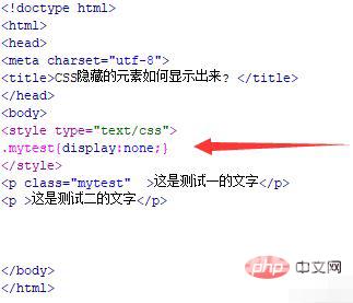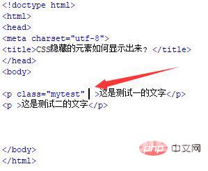 在css标签内,通过class(mytest)设置p标签的css样式,将display属性设置为none,实现p标签内容隐藏不可见。