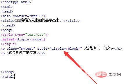 在隐藏的p标签内,使用style设置p标签的样式 ,将display属性设置为block,实现隐藏的p标签显示出来。