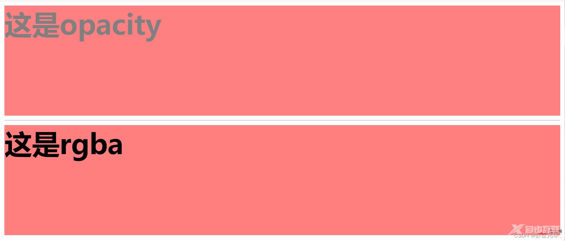 <style> .opacity{ width: 100%; height: 200px; font-size: 50px; font-weight: bold; background-color: #f00; opacity: 0.5; } .rgba{ width: 100%; height: 200px; font-size: 50px; font-weight: bold; background-color: #f00; background: rgba(255, 0, 0, .5); }</style><body> <div class="opacity">这是opacity</div> <hr> <div class="rgba">这是rgba</div></body>