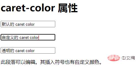 <!DOCTYPE html><html><head><style>.example1 { caret-color: red;}.example2 { caret-color: transparent;}</style></head><body><h1>caret-color 属性</h1><input value="默认的 caret color"><br><br><input class="example1" value="自定义的 caret color"><br><br><input class="example2" value="透明的 caret color"><p contenteditable class="example1">此段落可以编辑。其插入符号也有自定义颜色。</p></body></html>运行效果: