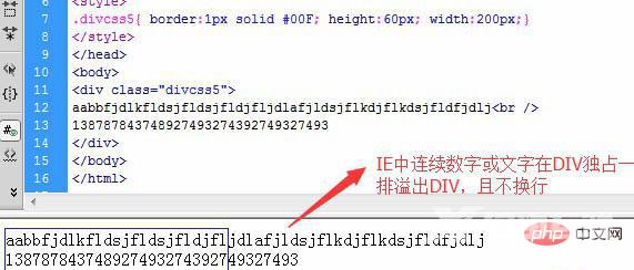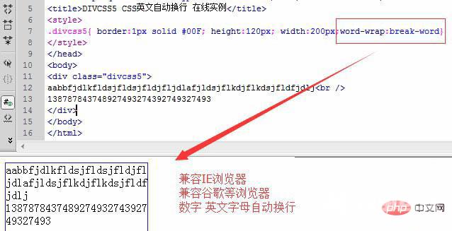 <!DOCTYPE html><html> <head> <meta http-equiv="Content-Type" content="text/html; charset=utf-8" /> <title></title> <style> .p{ border:1px solid #00F; height:120px; width:200px;word-wrap:break-word} </style> </head> <body> <div class="p">aabbfjdlkfldsjfldsjfldjfljdlafjldsjflkdjflkdsjfldfjdlj <br />138787843748927493274392749327493</div> </body></html>实例效果截图