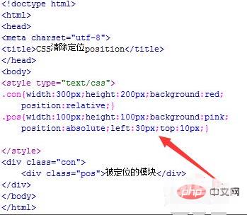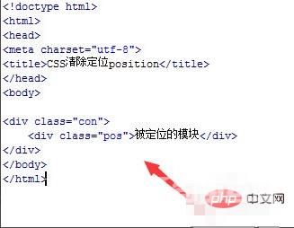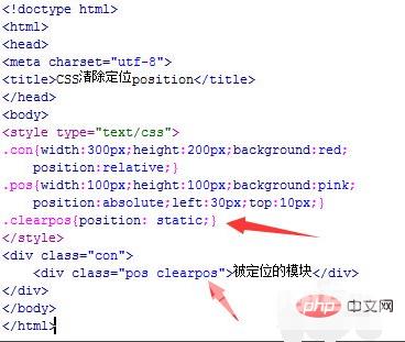在css标签内,再创建一个类名为clearpos的样式,将position属性设置为static,即清除定位属性,凡是添加了该类名样式,都会清除定位。将此类名添加到div为pos的模块上,清除它的定位。