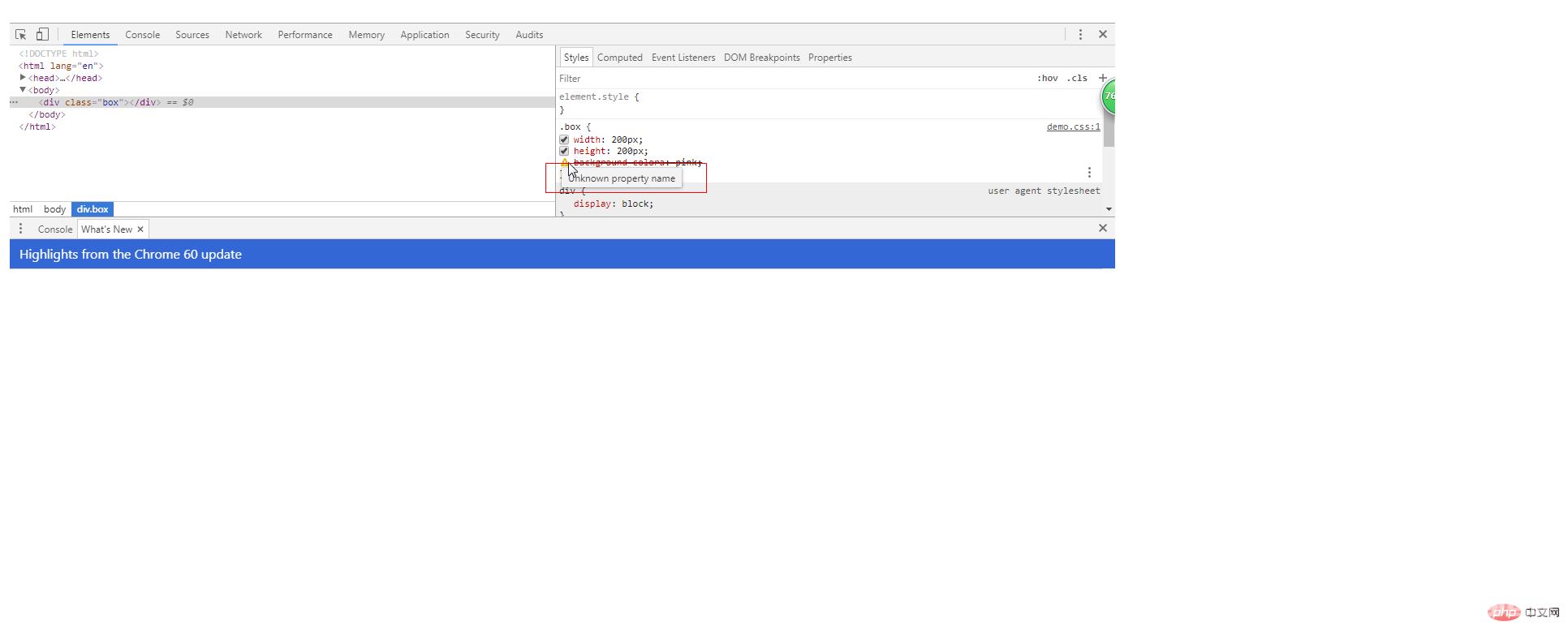 以谷歌浏览器的开发者工具为例,一般语法错误会显示为该样式被划去,样式左侧有图标提示,鼠标移入会显示英文提示。如下图所示: