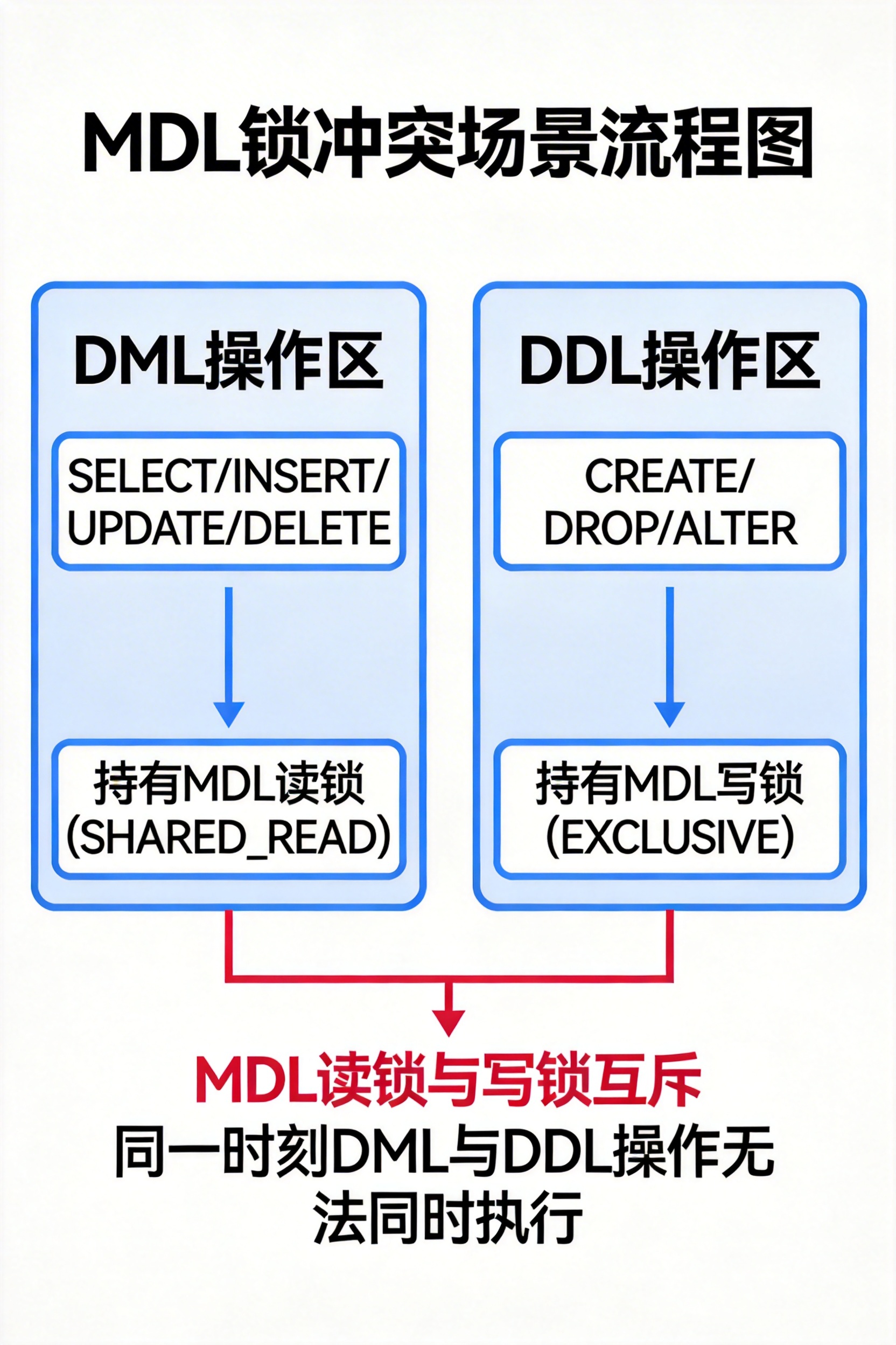 MDL 读锁之间不互斥,读锁和写锁、写锁和写锁是互斥的,这样就能防止一个事务在修改数据的时候,另一个事务突然改了表结构,导致数据不一致。