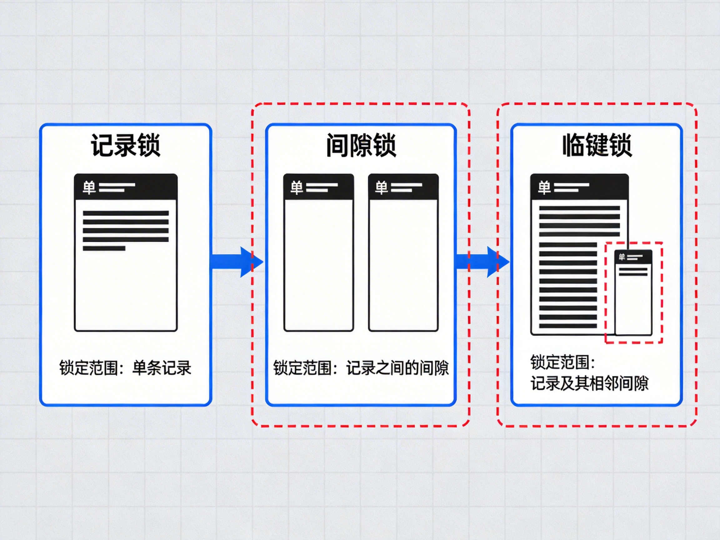 update user set name = '张三' where id = 1,如果 id 是主键,那就是给 id=1 的这行加记录锁。select * from user where id between 1 and 5 for update,会锁住 (1,3)、(3,5) 这两个间隙,防止其他事务在中间插入 id=2 或 4 的记录,解决幻读问题。select * from user where id > 3 for update,会锁住 (3,5]、(5, +∞) 这些区间,既锁住了存在的记录,也锁住了可能插入的间隙。