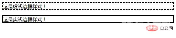 <!DOCTYPE html><html> <head> <meta charset="UTF-8"> <style type="text/css"> p.dashed { border-style: dashed } p.solid { border-style: solid } </style> </head> <body> <p class="dashed">这是虚线边框样式!</p> <p class="solid">这是实线边框样式!</p> </body></html>效果图: